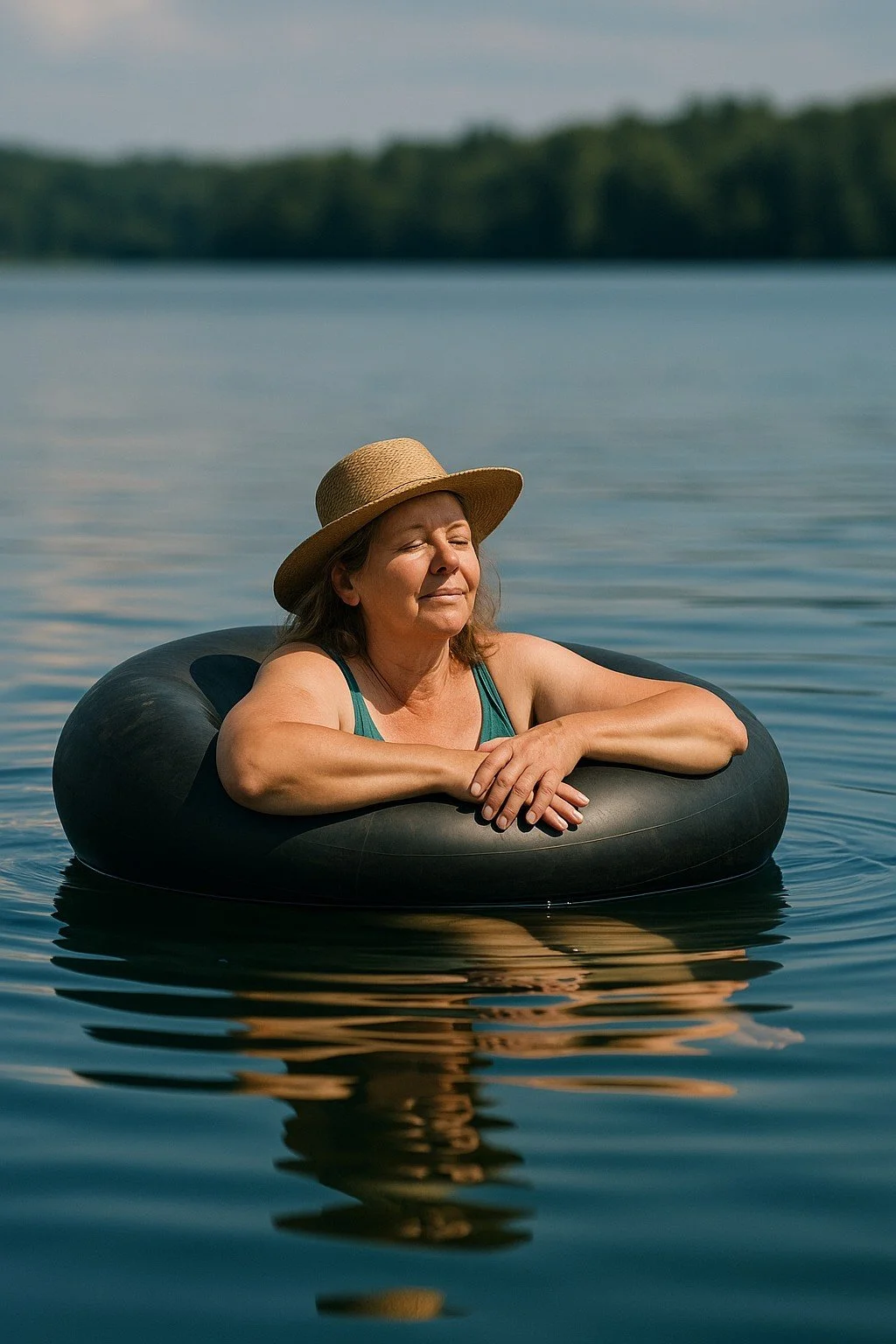 We used to walk to the lake, barefoot and ready to jump in the second we got there. I really wish some strong, good-looking boy would squat down, let me climb on his shoulders, and launch me through the air one more time. I can still feel the air rushing past, hear the splash. There were those huge tubes out in the middle of the lake that everyone tried to grab hold of so they didn’t have to swim. And the smaller ones, just right for floating around on our own—if those big strong boys ever left us alone.